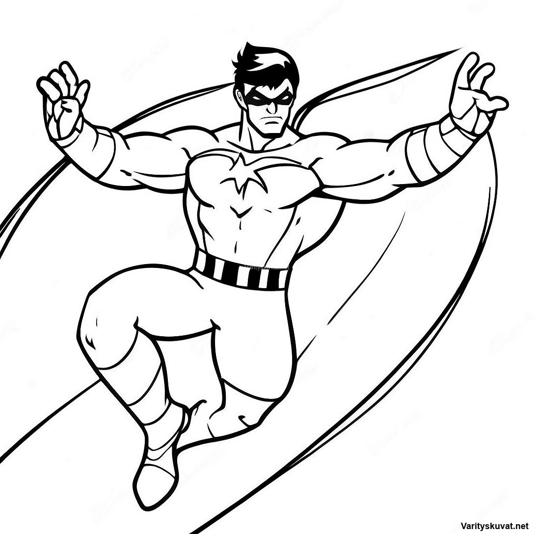 Vahva supersankari lentämässä taivaalla värityskuva