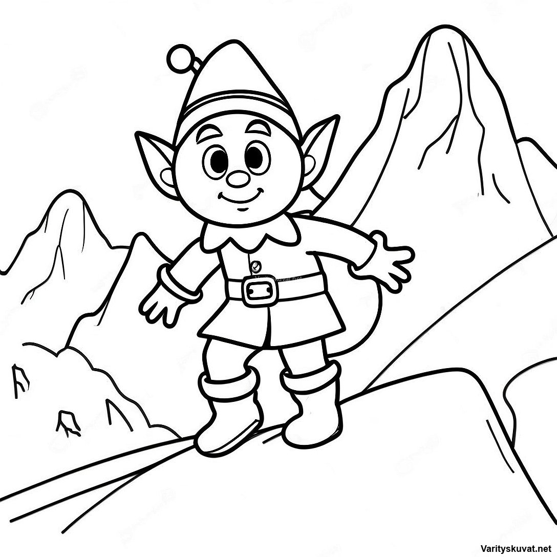 Lataa tulostettava PDF Seikkailunhaluinen Tonttu Lumisella Vuorella Värityskuva