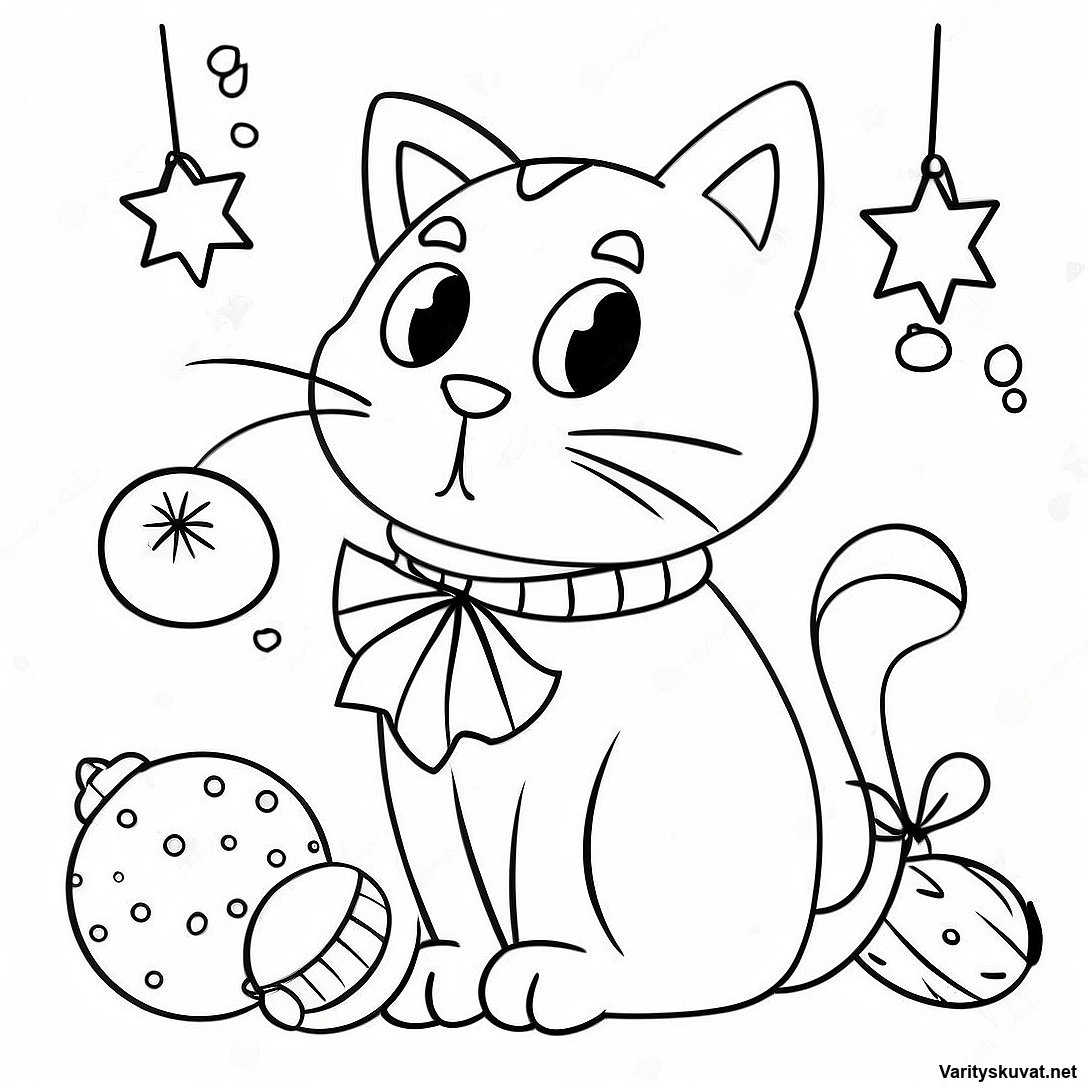 Lataa tulostettava PDF Söpö Joulukissa Leikkimässä Koristeilla Värityskuva