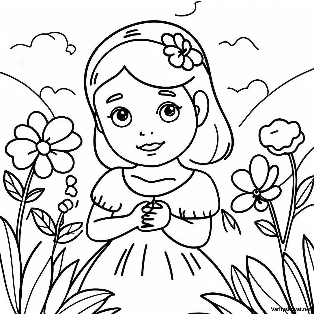 Lataa tulostettava PDF Söpö Tyttö Kukkatarhassa Värityskuva