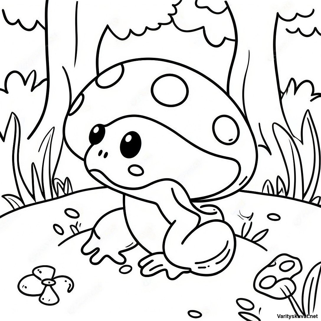Lataa tulostettava PDF Värikäs Sieni-Sammakko Metsämaisemassa Värityskuva
