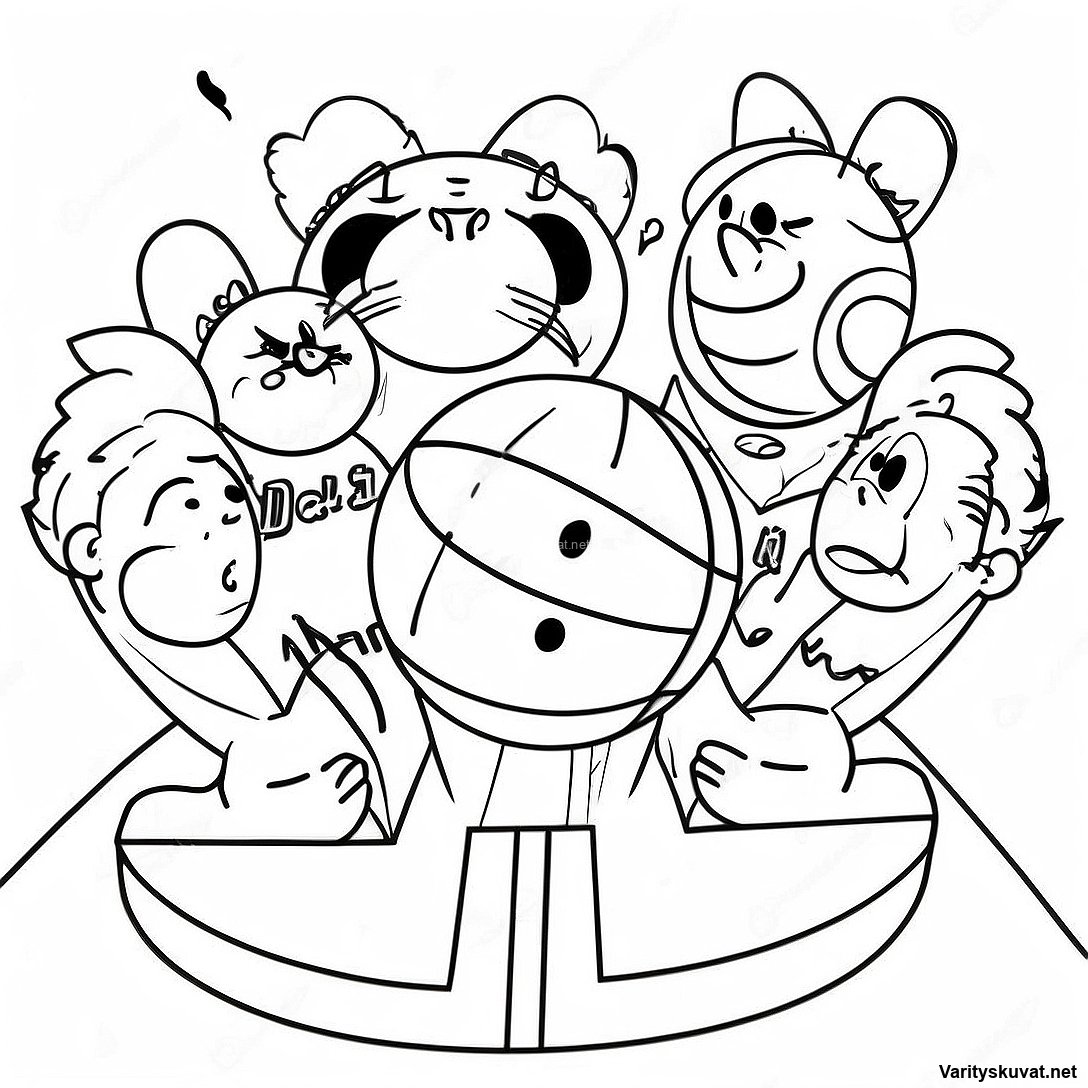 Iloiset lapset pelaamassa koripalloa värityskuva