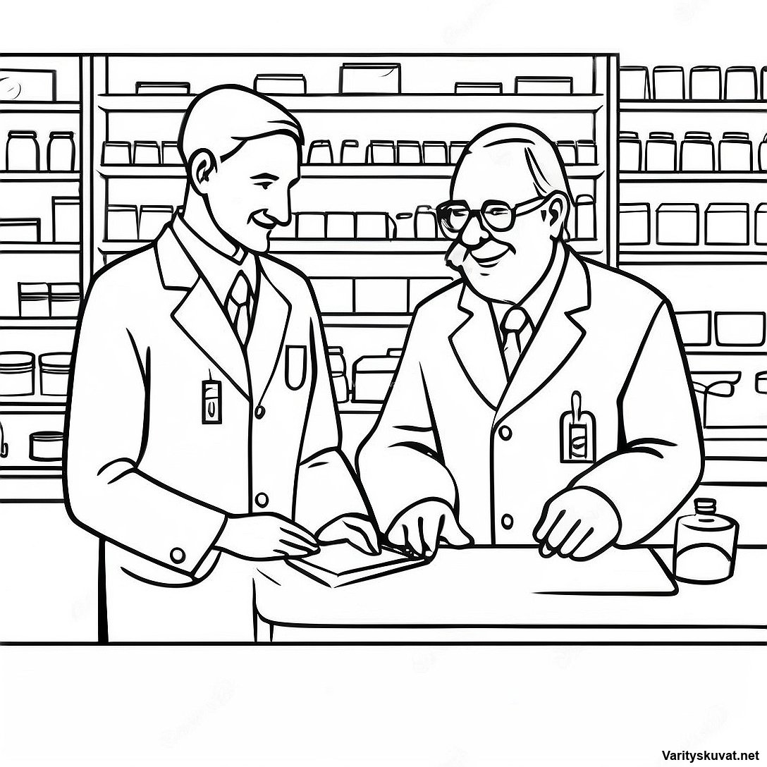 Lataa tulostettava PDF Ystävällinen Apteekkari Auttamassa Potilasta Värittämissivu